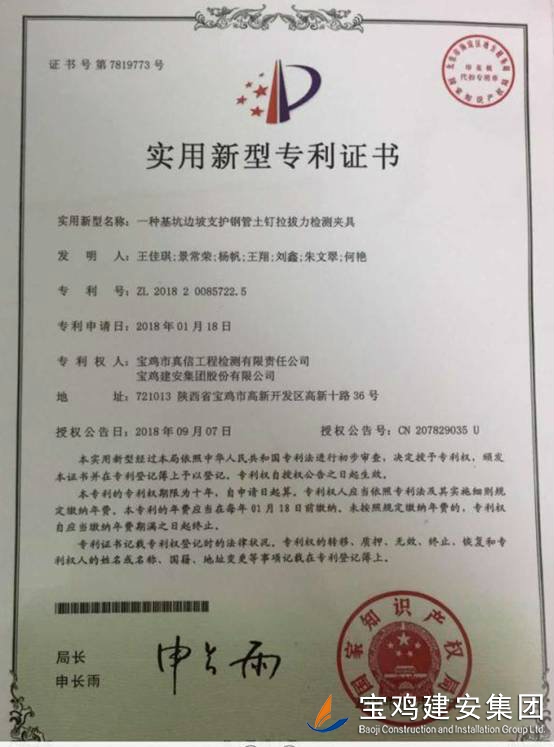 近日,由真信公司“楊帆創(chuàng)新工作室”自主研發(fā)的《一種基坑邊坡支護(hù)鋼管土釘拉拔力檢測夾具》獲得國家知識產(chǎn)權(quán)局批準(zhǔn),正式頒發(fā)實(shí)用新型專用證書!(專利號:ZL 2018 2 0085722.5) 這是我們真信公司建司18年來,也是我們單位建室48年來,第一個國家級發(fā)明專利,具有里程碑的意義!真信公司長期以來以“打造學(xué)習(xí)、創(chuàng)新型的團(tuán)隊(duì)”為目標(biāo),在日常的工程檢測工作中,不斷去探索、發(fā)現(xiàn)問題,及時的優(yōu)化,創(chuàng)新。 2017年9月,在公司的批準(zhǔn)及大力支持下,以楊帆同志命名的“楊帆創(chuàng)新工作室”正式成立了!工作室以“科學(xué)、嚴(yán)謹(jǐn)”為宗旨,以“解決日常檢測工作中遇到的頑疾,提高檢測工作效率及準(zhǔn)確性”為目標(biāo),正式投入到實(shí)用新型產(chǎn)品的研發(fā)之中。 土釘墻在工程中較多見,其主要是用于工程前期邊坡支護(hù)的工程,以防邊坡失穩(wěn)造成的邊坡塌方對人員生命財(cái)產(chǎn)安全及工程進(jìn)度造成損失。目前市場上檢測土釘?shù)睦蝺x和配套的夾具絕大部分是針對鋼筋土釘拉拔力設(shè)計(jì)的,而未涉及到鋼管土釘拉拔力專用夾具,從而未能對其進(jìn)行檢測,以至于不能有效的將檢測數(shù)據(jù)反饋給建設(shè)單位及設(shè)計(jì)單位來進(jìn)行指導(dǎo)施工和結(jié)果評判。這個問題長期以來困擾著廣大檢測工作者,給檢測工作及工程施工造成了諸多不良影響,創(chuàng)新,勢在必行! 作為工作室的首個研發(fā)項(xiàng)目,成員們克服日常工作任務(wù)繁重的困難,多次深入施工現(xiàn)場,親身體會,不斷地去嘗試,思索。在模具的制作過程中,為了讓產(chǎn)品更好的發(fā)揮出“實(shí)用型”的效果,工作室負(fù)責(zé)人楊帆同志多次前往加工車間,與技術(shù)人員緊密溝通,多次親自上手?;氐絾挝?,工作組即刻展開交流學(xué)習(xí),在電腦上反復(fù)的推敲、勾畫…… (寶雞真信工程檢測有限責(zé)任公司 秦建偉)