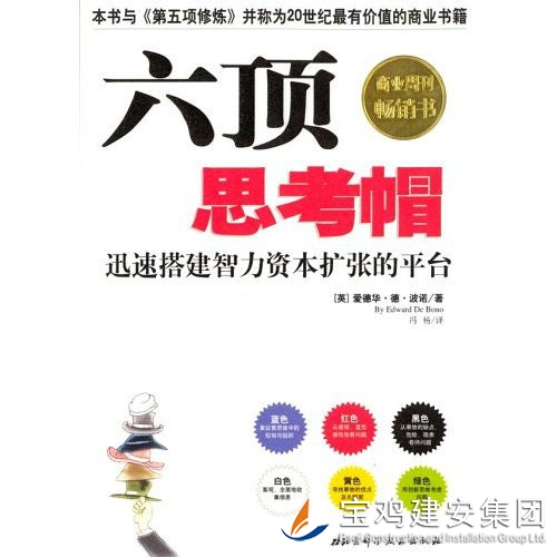 《六頂思考帽》是著名的英國創(chuàng)新思維家愛德華.德.博諾的作品,它通過六種不同顏色詮釋了六種不同的觀點(diǎn)。六頂分別是每個(gè)人都認(rèn)識(shí):藍(lán)、白、紅、黃、黑、綠這六種不同的顏色,之所以叫思考帽,是形象地讓人更容易理解和接受,也能夠想象到自己戴上或摘下不同顏色帽子的感受。 藍(lán)帽:觀察和管理思考。藍(lán)帽負(fù)責(zé)控制各種思考帽的使用順序,它規(guī)劃和管理整個(gè)思考過程,并負(fù)責(zé)做出結(jié)論。