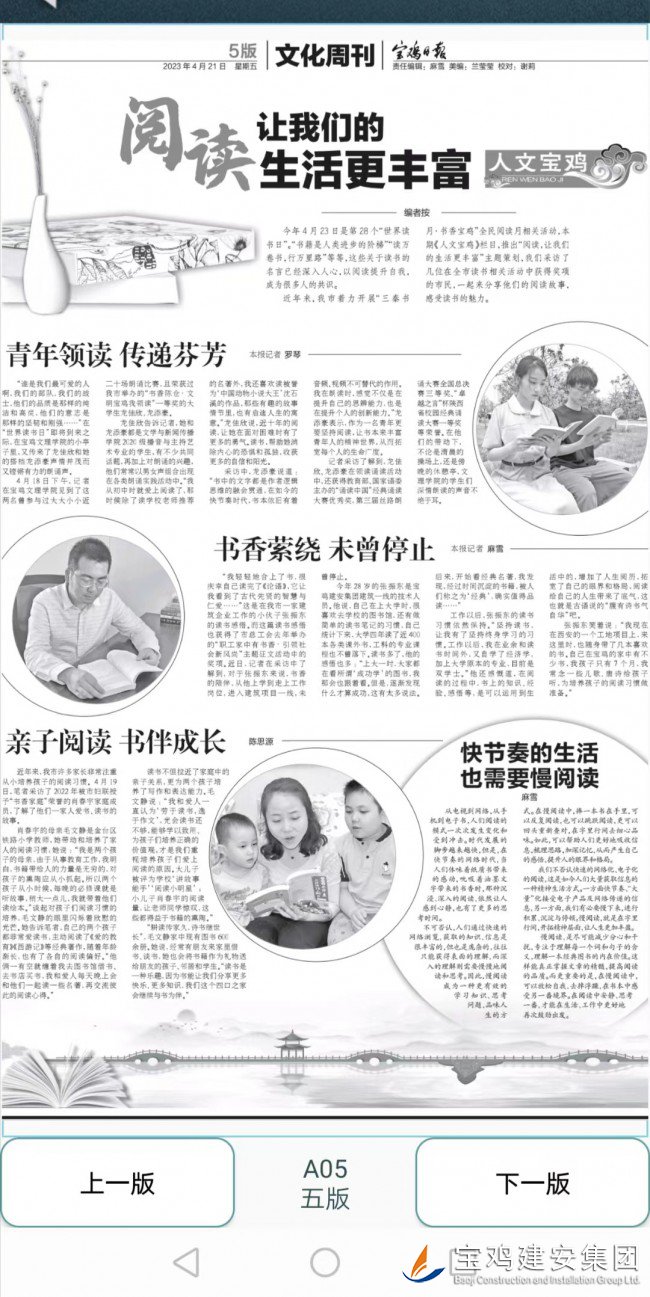 編者按:在第28個(gè)世界讀書(shū)日到來(lái)之際,《寶雞日?qǐng)?bào)》社策劃了讀書(shū)專(zhuān)版,鑒于寶雞建安集團(tuán)工會(huì)長(zhǎng)期堅(jiān)持舉辦的“書(shū)香企業(yè)”征文活動(dòng)在社會(huì)的影響力與美譽(yù)度,記者來(lái)電提出采訪(fǎng)意向,公司工會(huì)極力舉薦了來(lái)自基層一線(xiàn)熱愛(ài)閱讀并多次參與讀書(shū)征文的技術(shù)人員張振東同志。5月21日,《寶雞日?qǐng)?bào)》發(fā)表了這篇小專(zhuān)訪(fǎng),現(xiàn)予轉(zhuǎn)發(fā)。