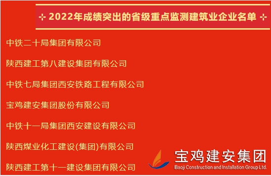 近日,陜西省建筑業(yè)協(xié)會(huì)發(fā)出通知,對(duì)全省26家“成績(jī)突出的省級(jí)重點(diǎn)監(jiān)測(cè)建筑業(yè)企業(yè)”進(jìn)行通報(bào)嘉獎(jiǎng),寶雞建安集團(tuán)股份有限公司榜上有名。